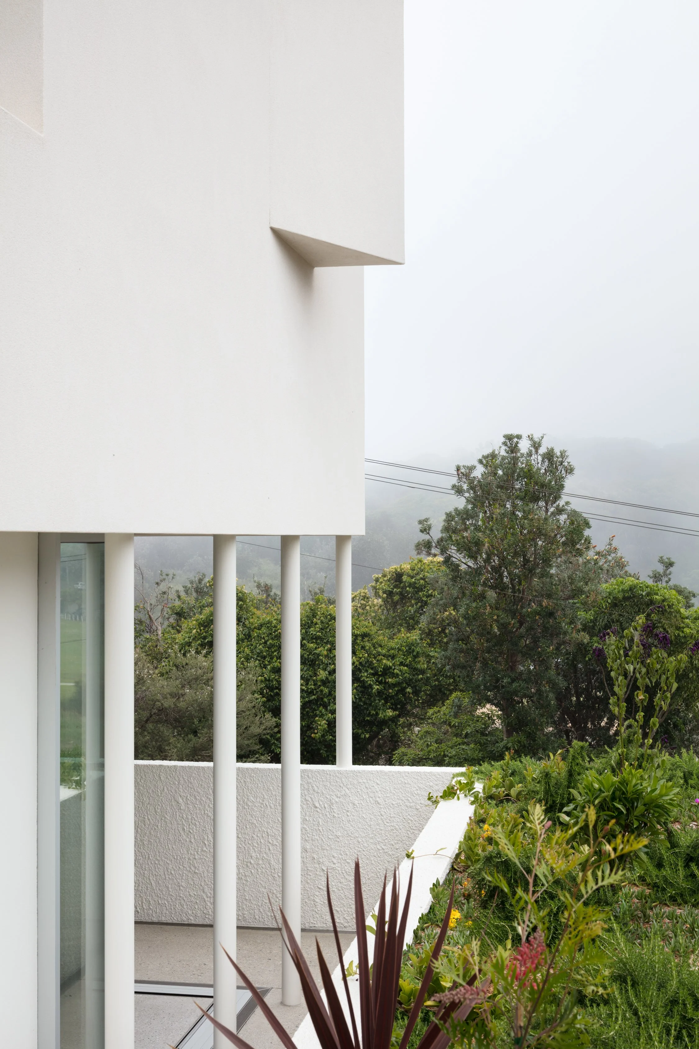 There is a considerable investment in architectural and material composition that masterfully edits and plays with the local context. The house’s soft, white textures are amplified by the green hues outside, while the atmosphere of the interior is constructed from more than just a good view. The solid balustrade wall, the partially-recessed windows and doors, and the setting in of the line of enclosure to form an awning all combine to suggest an expansive interior. The rooms easily incorporate the balcony as a continuous space rather than as a separate one, blurring the line be- tween inside and out to celebrate an outdoor lifestyle and take advantage of its comfortable coastal climate.